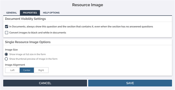 (2) Inside the Resource Image question, in the General tab, make sure Hidden on reports is deselected: