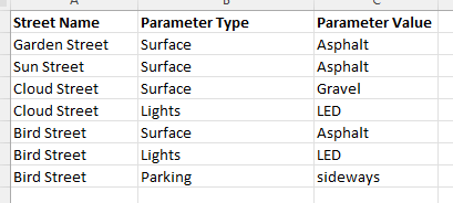 - After he has chosen the parameter types he wants to see, he should see a list that shows the rows of the data source that correspond to the selected streets and parameter types.