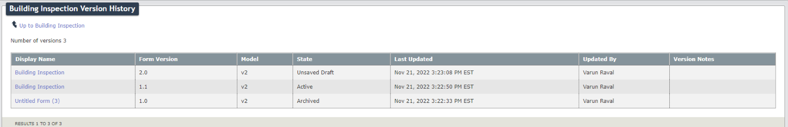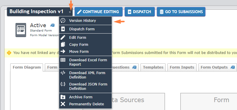 You can check the version and state of the Form by clicking on ‘Version History’ from the dropdown menu.